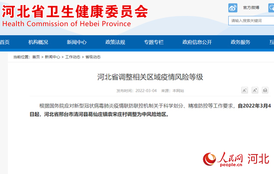 人民網石家莊3月4日電 據河北省衛健委發布的最新消息,根據國務院應對新型冠狀病毒肺炎疫情聯防聯控機製關(guan) 於(yu) 科學劃分、精準防控等工作要求,自2022年3月4日起,河北省將邢台市清河縣葛仙莊鎮袁宋莊村調整為(wei) 中風險地區。