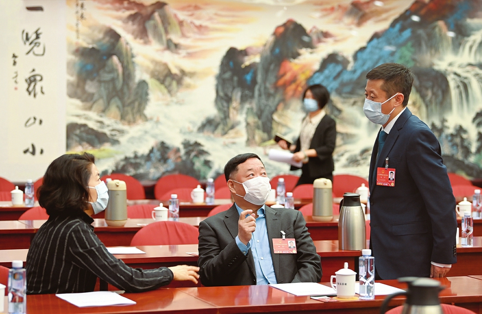 圖為(wei) 閻美蓉、郝旭、劉正代表(左起)在一起交流。(記者李聯軍(jun) 攝)