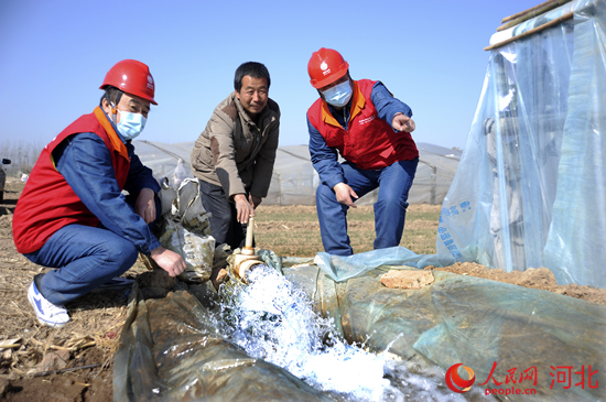 國網阜城縣供電公司員工在蔣坊鄉(xiang) 張屯村為(wei) 春灌農(nong) 戶排查灌溉機井用電設備運行情況。 門洪昌攝