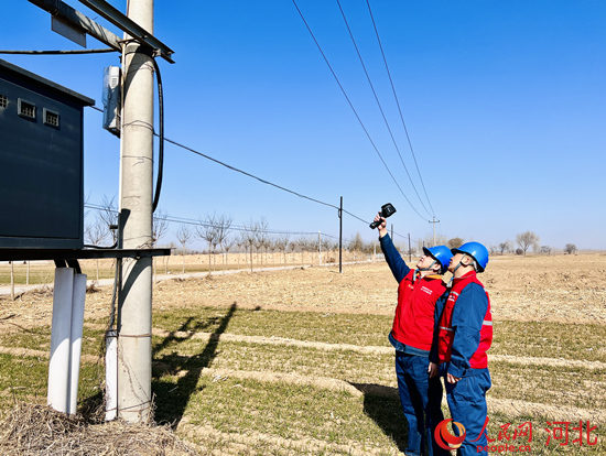 國網高陽縣供電公司共產(chan) 黨(dang) 員服務隊對10千伏西演農(nong) 業(ye) 分支線路及設備開展巡視測溫工作,保障春灌用電無後顧之憂。 王素傑攝