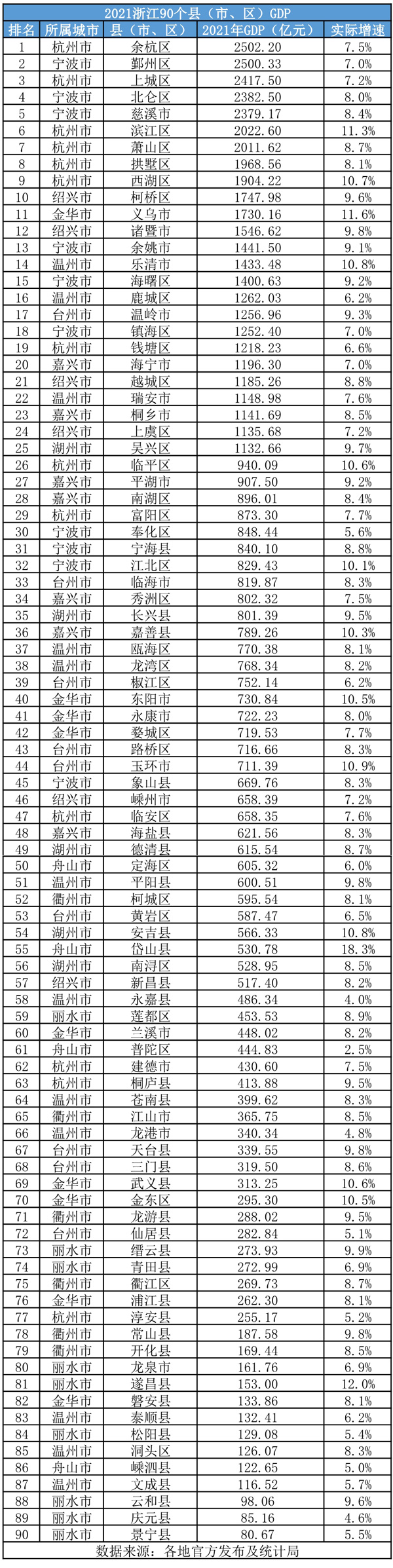 2021年浙江省各縣(市、區)GDP總量排名。製圖:葉賓得
