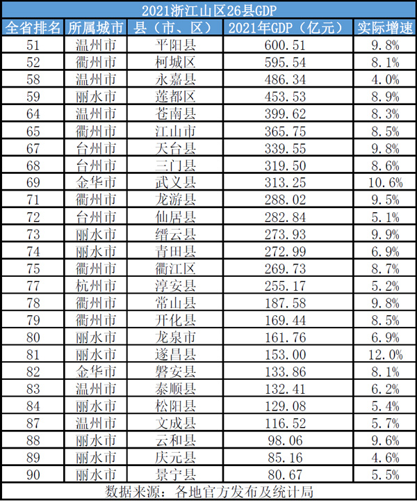 2021年浙江山區26縣GDP總量排名。製圖:葉賓得