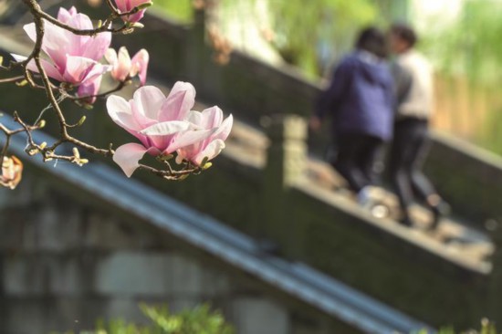3月13日下午,嘉興(xing) 海寧市區市河中心的“口袋公園”小蕩公園春色撩人,粉色的玉蘭(lan) 花、白色的櫻花點綴其中,吸引市民前來打卡。(石月平)