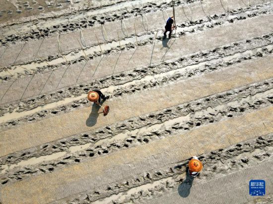 3月13日,在湖南省婁底市雙峰縣井字鎮花橋村,農(nong) 民在秧田勞作(無人機拍攝)。