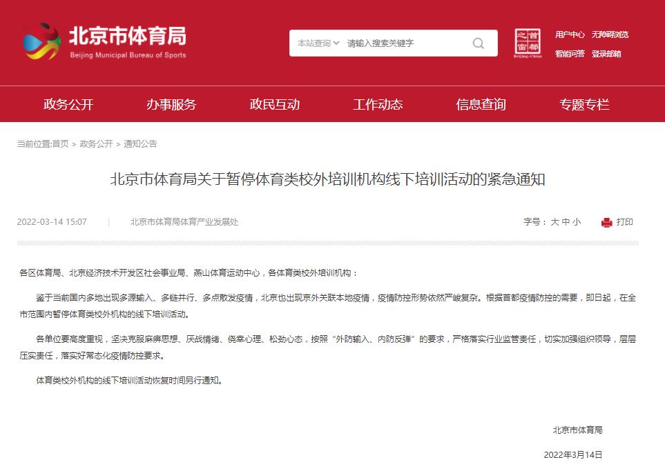 北京:全市範圍內暫停體育類校外機構的線下培訓活動