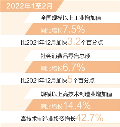 工業(ye) 、服務業(ye) 逐步回升。1至2月,全國規模以上工業(ye) 增加值同比增長7.5%,比2021年12月加快3.2個(ge) 百分點,41個(ge) 大類行業(ye) 中超過九成行業(ye) 實現增長;全國服務業(ye) 生產(chan) 指數同比增長4.2%,比2021年12月加快1.2個(ge) 百分點。