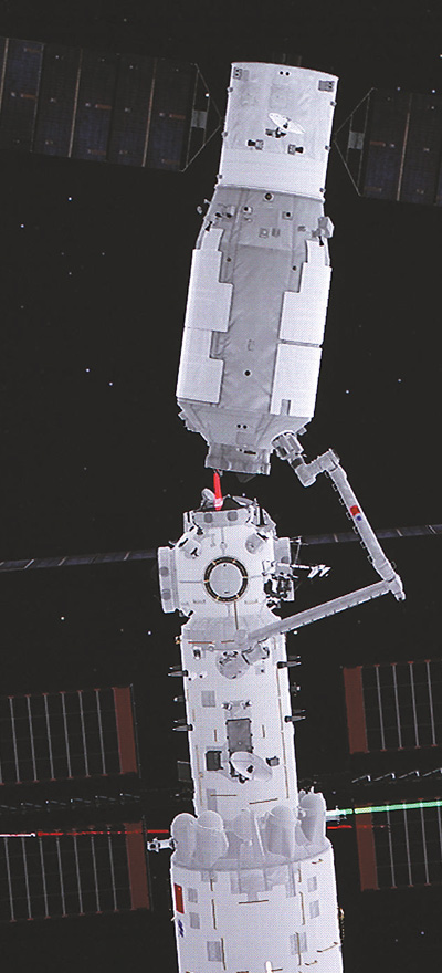 在北京航天飛行控製中心拍攝的空間站機械臂轉位貨運飛船試驗畫麵,天舟二號貨運飛船在機械臂拖動下,以核心艙節點艙球心為(wei) 圓心進行平麵轉位。
