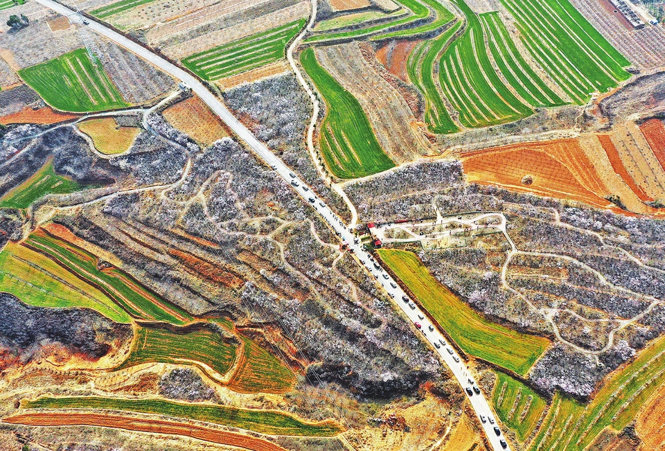 3月14日,無人機拍攝的畫麵。連日來,垣曲縣嶺回村5000畝(mu) 山桃花鬥豔綻放,與(yu) 綠油油的麥苗相映襯,構成一幅多彩的美麗(li) 圖畫。眾(zhong) 多市民在認真做好疫情防護的同時,三三兩(liang) 兩(liang) 走出戶外,親(qin) 近大自然,感受大自然,領略美麗(li) 鄉(xiang) 村春日無限風光。(魯國林攝)