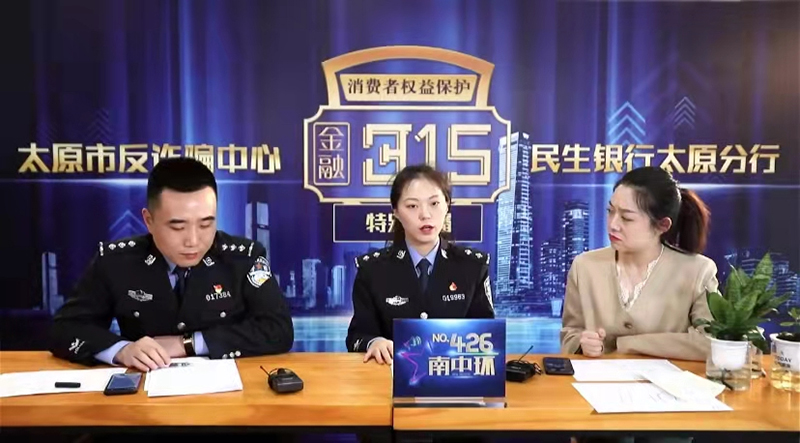 人民網太原3月15日電 為(wei) 進一步增強人民群眾(zhong) 防範電信網絡詐騙意識,發揮公安機關(guan) 和金融行業(ye) 的宣傳(chuan) 合力,3月15日下午,太原市反詐騙中心與(yu) 民生銀行太原分行聯合開展了“3·15”專(zhuan) 題防範電信網絡詐騙直播活動,為(wei) 廣大群眾(zhong) 帶來了滿滿的防詐騙“幹貨”。