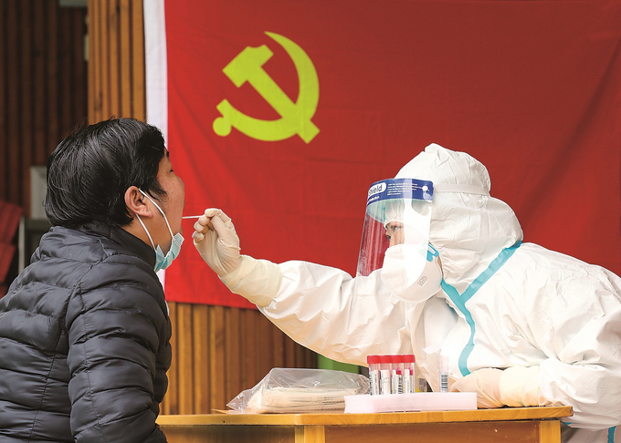 南京一處核酸檢測點,黨(dang) 旗高懸。 本報記者 陳儼(yan) 攝
