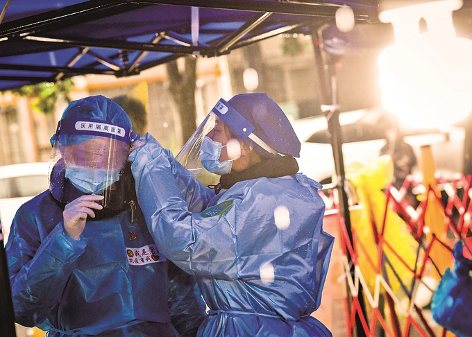 3月20日,南京雨花台區梅欣西區廣場核酸檢測采樣點,雨中堅守的誌願者互相整理起霧的防疫裝備。 本報記者 萬(wan) 程鵬 攝