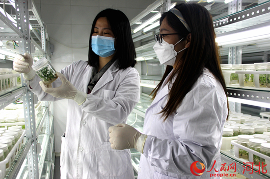 定州市綠穀農(nong) 業(ye) 科技發展有限公司工作人員在無菌培養(yang) 室察看新型育苗的長勢情況。 周永攝