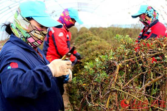 技術人員在定州二明月季種植基地修剪月季。 周永攝