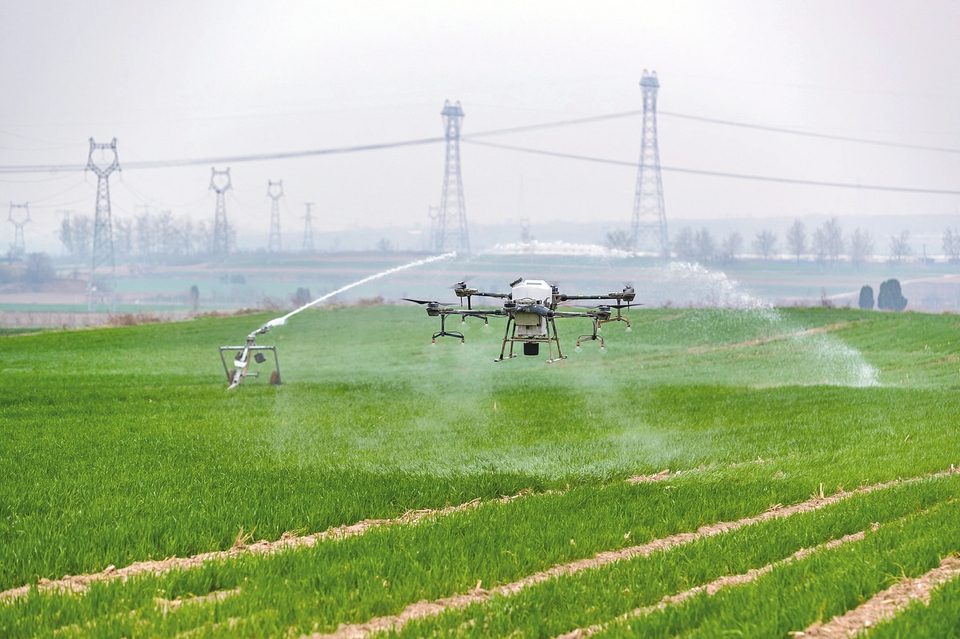 3月21日,在運城市夏縣胡張鄉(xiang) 新晉村有機旱作小麥基地,當地農(nong) 民利用植保無人機為(wei) 麥田施肥。眼下正值春耕春管的關(guan) 鍵期,夏縣糧農(nong) 搶抓有利農(nong) 時,對全縣31.6萬(wan) 畝(mu) 冬小麥開展病蟲草害和極端天氣的應對防範,及早動手澆水、施肥、噴藥,全麵開展春季麥田管理,提高畝(mu) 產(chan) 效益,為(wei) 全年糧食豐(feng) 收打下堅實基礎。(閆鑫攝)