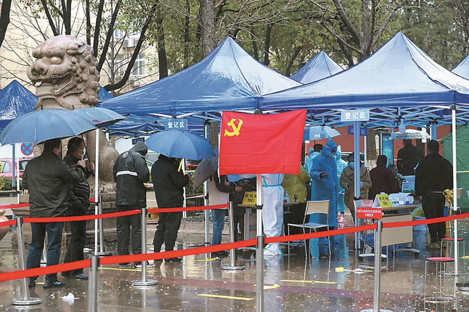 南京市發布關(guan) 於(yu) 疫情防控措施動態升級調整的通告(第11號),自21日起,南京市在全市開展新一輪分區域規模性核酸檢測。圖為(wei) 鼓樓區下關(guan) 街道閱江樓核酸檢測點,市民在接受核酸采樣。 本報記者 陳儼(yan) 攝