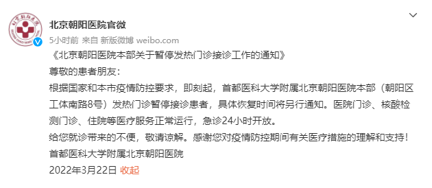 人民網北京3月22日電 據北京朝陽醫院官微消息,根據國家和北京市疫情防控要求,即刻起,首都醫科大學附屬北京朝陽醫院本部(朝陽區工體(ti) 南路8號)發熱門診暫停接診患者,具體(ti) 恢複時間將另行通知。醫院門診、核酸檢測門診、住院等醫療服務正常運行,急診24小時開放。