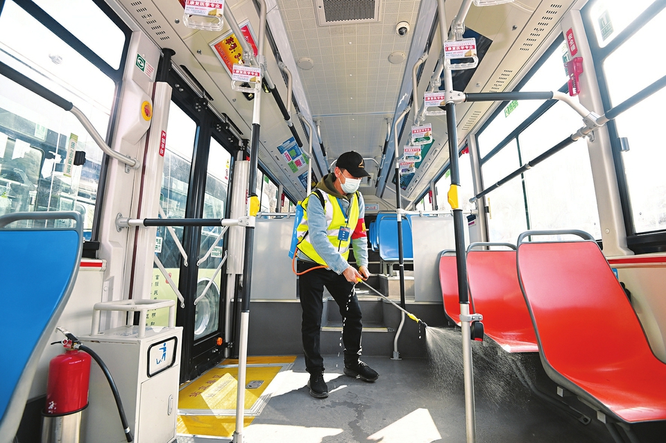 3月16日,太原公交三公司三車隊內(nei) ,工作人員正在對公交車座位、拉手進行消殺,嚴(yan) 格執行疫情防控措施,確保市民乘車安全。(記者阮洋攝)