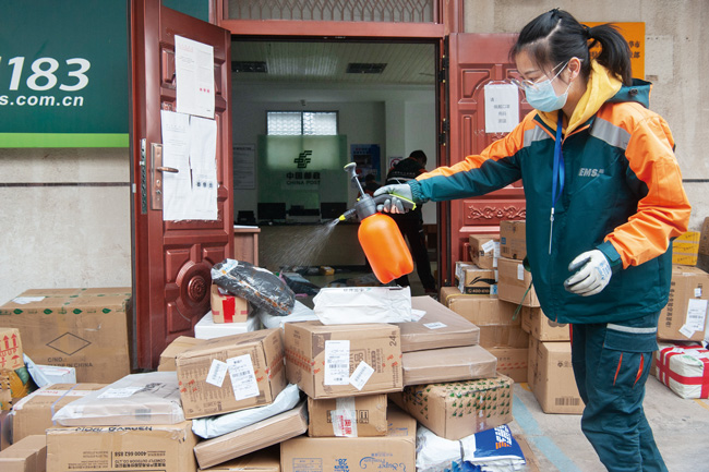 3月20日,在金華一快遞公司人民東(dong) 路特快專(zhuan) 遞攬投部,員工給快件和派送車輛噴灑藥水進行消殺。據了解,為(wei) 做好新冠疫情防控工作,運載快件的大型車輛到達後,卸貨前先要對車輛消殺,再給快件消殺;快遞員每次出車派送返回攬投部,都要按要求給車輛消殺。工作場地每天早、中、晚消殺3次,記錄在工作台賬上。(時寬兵)