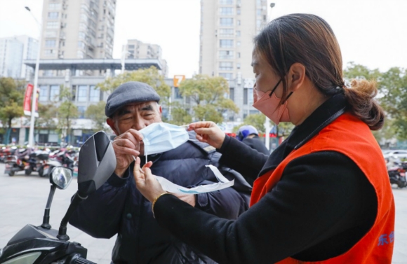 誌願者在街頭為(wei) 群眾(zhong) 免費發放口罩,宣傳(chuan) 防疫知識。張莉琳攝