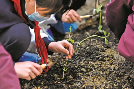 3月23日,嘉興(xing) 一學校種植園,學生們(men) 在各班的“責任田”裏忙著種植各種蔬菜和花卉。學校希望通過豐(feng) 富多彩的種植活動,讓孩子們(men) 在親(qin) 近植物、探究植物的過程中,提升綜合探究學習(xi) 能力,同時也更好地推進學校“雙減”政策的落地。(馮(feng) 玉坤)