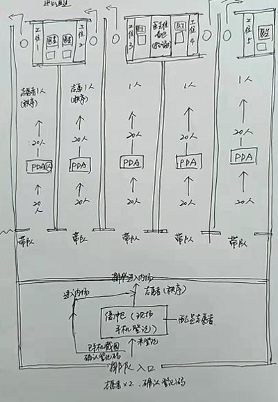 在總結每輪檢測工作經驗的基礎上,夏朵園居民區根據手繪圖,自創了“手形”動線,即有序安排居民分批在“手臂”處排隊,在“手腕”處“截流”安排誌願者掃碼核驗,隨後分流至“手指”處的工位完成檢測後再離開,避免了進出人流的對衝(chong) ,防止了人員集聚,更提高了檢測效率。