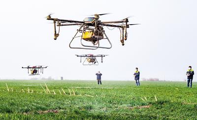 3月19日,石家莊市溫德格信農(nong) 業(ye) 科技有限公司工作人員在石家莊市欒城區南高鄉(xiang) 魯家莊村麥田裏使用無人植保機作業(ye) 。河北日報通訊員 李明發攝