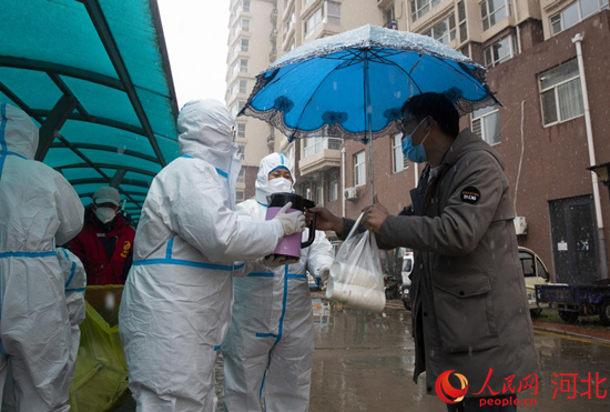 “辛苦了!喝點熱水吧!”滄州當地居民為(wei) 雪天裏堅守的抗疫白衣工作者送去暖心的熱水。 牛建才攝