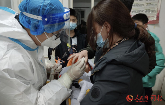 3月18日,海興(xing) 縣小山鄉(xiang) 9個(ge) 月大的寶寶被媽媽抱著接受核酸檢測。 梁妍婧攝