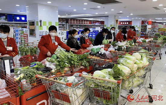 滄州千方百計保證市場供應(圖為(wei) 近日當地超市工作人員分揀打包蔬菜)。 滄州市商務局供圖