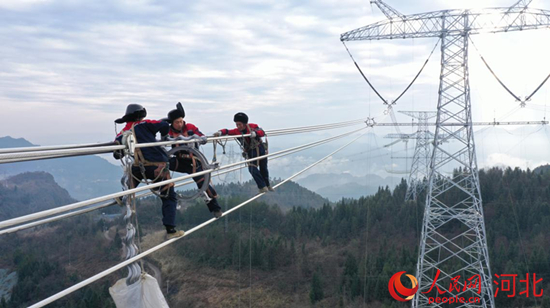 河北送變電公司高空作業(ye) 人員認真開展架線施工。 王學恩攝