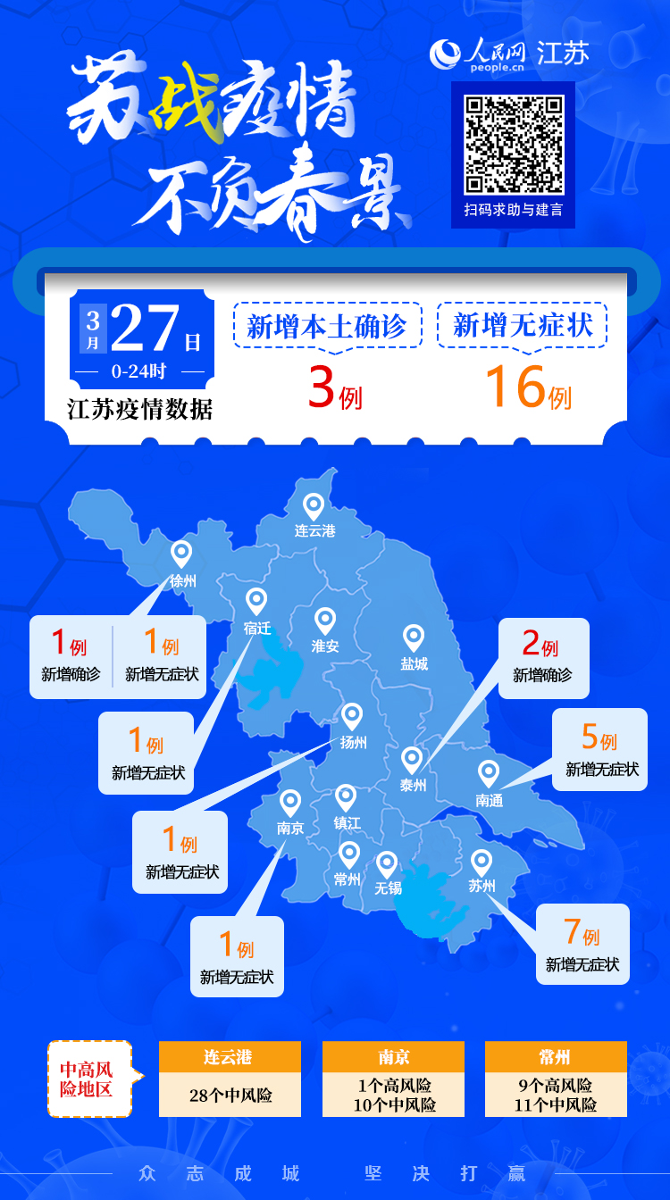3月27日江蘇新增本土確診病例3例 本土無症狀感染者16例