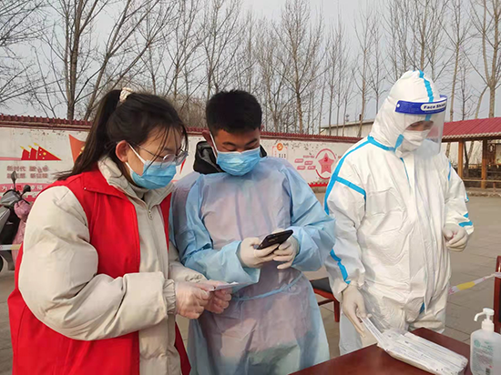 遷安市太平莊鎮蘇各莊營村大學生誌願者掃碼登記。 商立超攝