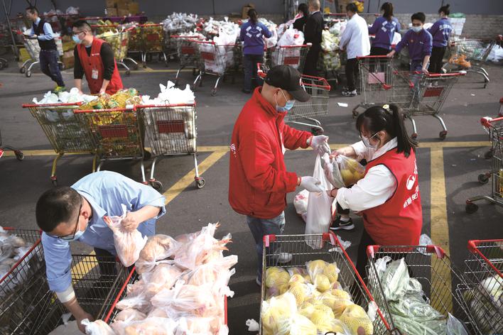 3月29日,在嘉興(xing) 市區一超市秀洲店,店員們(men) 加班加點打包蔬菜、肉、油等1500份物資。這些物資將被送到“三區”,保障群眾(zhong) 的日常生活需求。(王振宇)