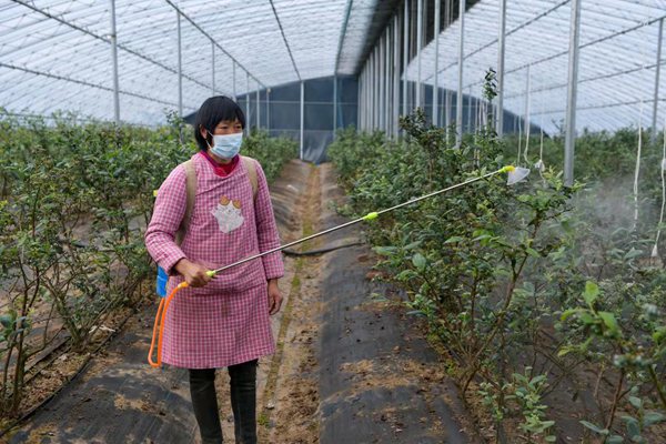村民在大興(xing) 鎮藍莓專(zhuan) 業(ye) 種植合作社溫室大棚裏管護藍莓
