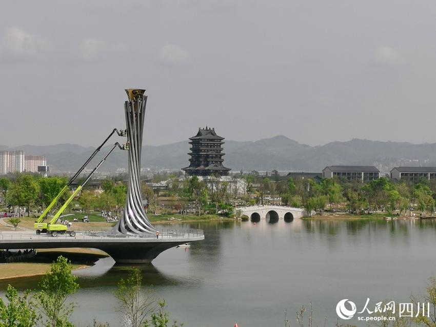 在體(ti) 育館對麵的東(dong) 安湖畔,有一座高聳挺立的火炬塔。它的高度是31米,象征著本屆大運會(hui) 是第31屆大運會(hui) 。12個(ge) 高大的螺旋形板狀裝飾構件,從(cong) 塔底向上延展,在空中托舉(ju) 出一個(ge) 金杯一樣造型的火炬。五冶集團另一位工作人員秦天介紹,這個(ge) 塔身設計的靈感也是來源於(yu) “太陽神鳥”。“太陽神鳥”標誌上有12道光芒,火炬塔上也有12個(ge) 螺旋構件。