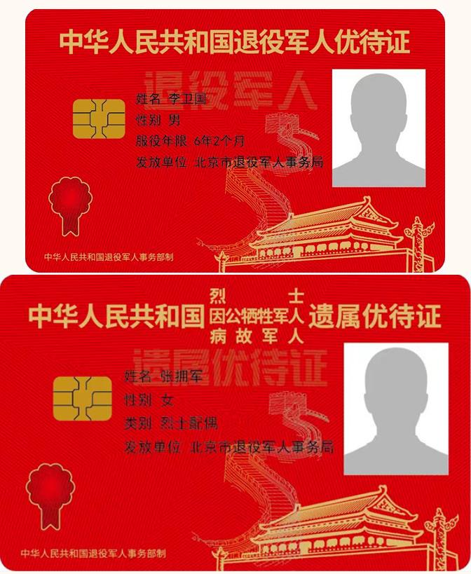 據介紹,優(you) 待證以紅色為(wei) 基調,正麵印有優(you) 待證種類名稱,持證人基本信息、相片等。背麵印有製證銀行名稱、銀行卡號等信息。優(you) 待證分為(wei) “中華人民共和國退役軍(jun) 人優(you) 待證”“中華人民共和國烈士、因公犧牲軍(jun) 人、病故軍(jun) 人遺屬優(you) 待證”兩(liang) 種,分別麵向符合條件的退役軍(jun) 人和烈士遺屬、因公犧牲軍(jun) 人遺屬、病故軍(jun) 人遺屬等其他優(you) 撫對象免費發放,是持證人彰顯榮譽的載體(ti) 、享受優(you) 待的憑證。