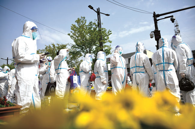 3月30日,嘉興(xing) 經開區城南街道新月公寓的居民,在工作人員的引導下,有序登上疫情防控專(zhuan) 用大巴,前往各醫學觀察隔離點。(王振宇)