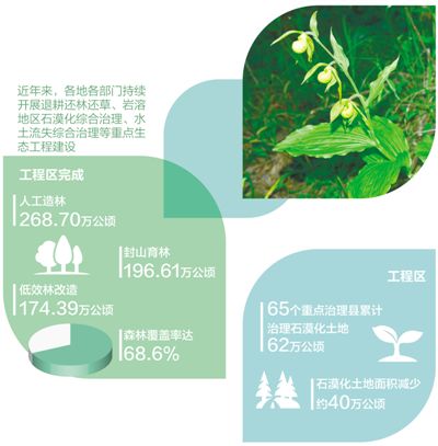 近年來,各地各部門持續開展退耕還林還草、岩溶地區石漠化綜合治理、水土流失綜合治理等重點生態工程建設。據統計,工程區完成人工造林268.70萬(wan) 公頃、封山育林196.61萬(wan) 公頃、低效林改造174.39萬(wan) 公頃,森林覆蓋率達68.6%;工程區65個(ge) 重點治理縣累計治理石漠化土地62萬(wan) 公頃,石漠化土地麵積減少約40萬(wan) 公頃。
