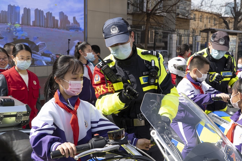 同時,龍城鐵騎隊員向學生詳細地講解了“鐵騎”的構造及各種裝備的功能,並與(yu) 同學們(men) 一起學習(xi) 交通安全知識,演示交通手勢。現場,副大隊長趙磊以講故事的形式提醒學生要遵守交通規則,不要在人行道上追逐打鬧、過馬路要走人行橫道以及正確乘坐車輛等交通安全知識。