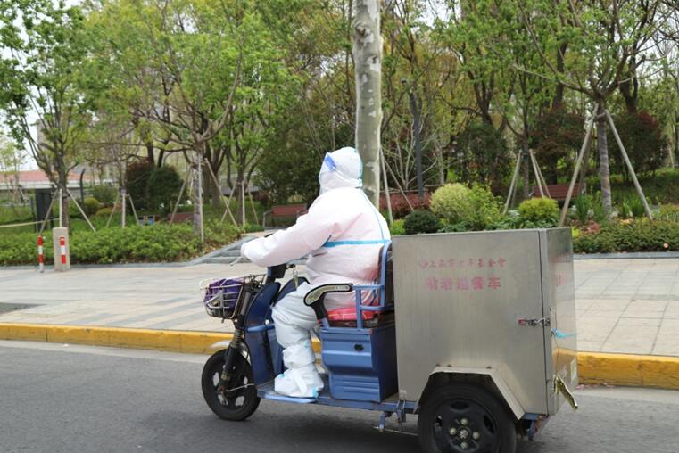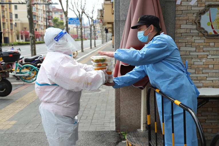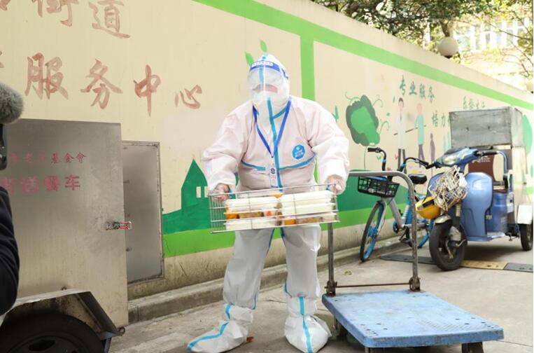 人民網上海4月1日電 (葛俊俊)上海浦西核酸篩查首日。上午10:00,送餐員馬俊紅和張紅喜帶著剛剛出鍋的230份助老餐出發了。