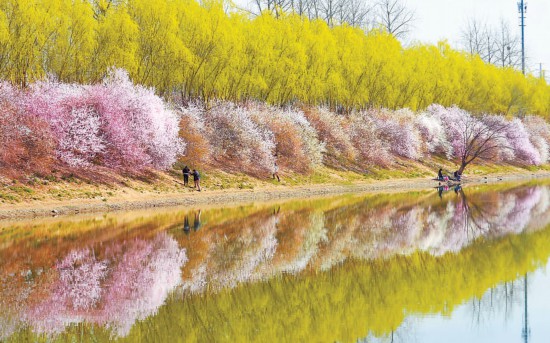 清明假期,在朝陽區壩河兩(liang) 岸,翠柳拂堤,岸邊綻放的花朵如彩雲(yun) 般鋪陳開來,映在碧波中,描繪出一幅春的畫卷。市民們(men) 踏青賞花,享受愜意的假日時光。本報記者方非攝