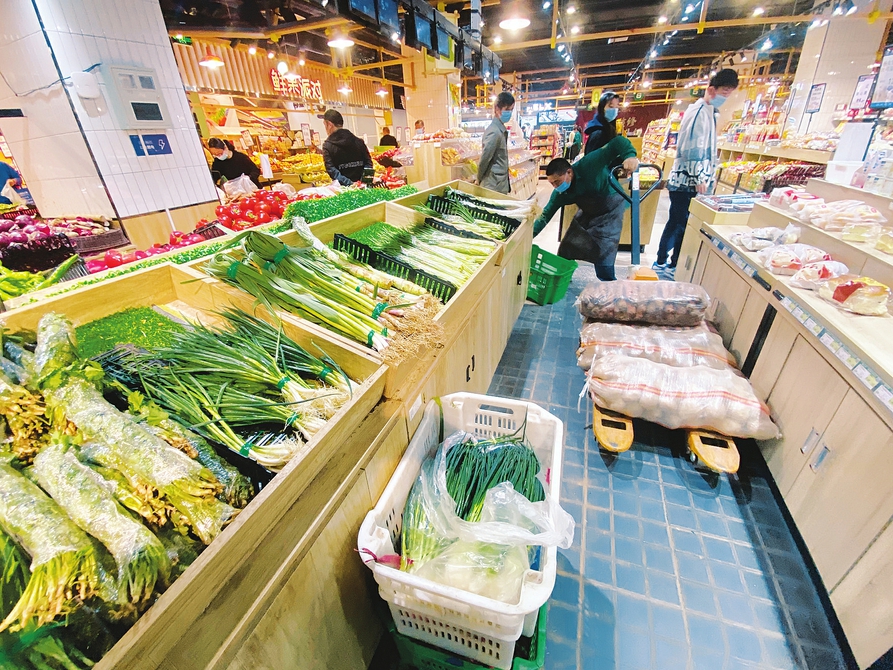 4月3日,太原市萬(wan) 柏林區千峰南路一家超市內(nei) ,工作人員為(wei) 店內(nei) 貨架補貨,以保障市民正常選購。 記者阮洋攝