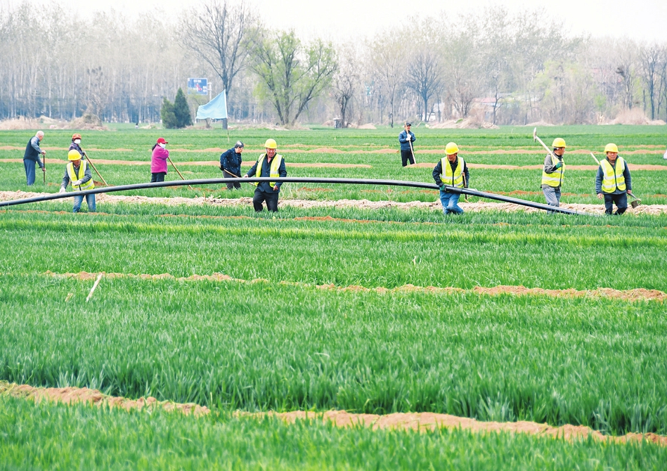 4月2日,在翼城縣南梁鎮梁壁村高標準建設農(nong) 業(ye) 生產(chan) 基地,技術人員在安裝節水管道。該基地著力在“高效節水”上蹚出一條新路徑,通過智能管灌、智能噴灌、智能滴灌三項高效節水措施,為(wei) 農(nong) 業(ye) 灌溉充分利用地表水、合理使用淺層水、嚴(yan) 控地下水提供先例打好基礎,確保糧食豐(feng) 產(chan) 增收。(閆銳鵬攝)
