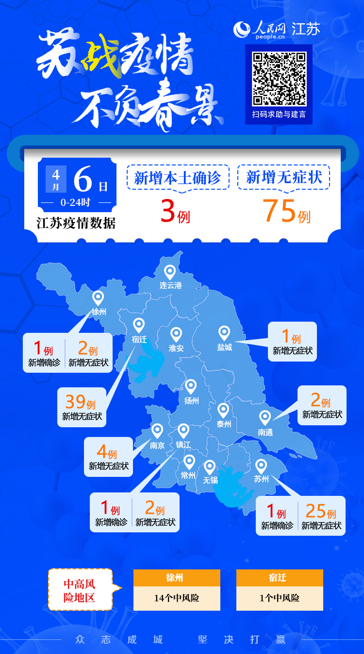4月6日江蘇新增本土確診病例3例 本土無症狀感染者75例