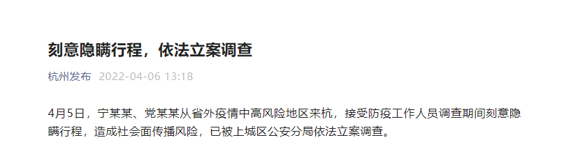 人民網杭州4月6日電 (艾宇韜)據杭州市新冠肺炎疫情防控指揮部最新消息,4月5日,兩(liang) 名從(cong) 省外疫情中高風險地區來杭人員寧某某、黨(dang) 某某,在接受杭州防疫工作人員調查期間刻意隱瞞行程,造成社會(hui) 麵傳(chuan) 播風險,目前已被杭州市上城區公安分局依法立案調查。