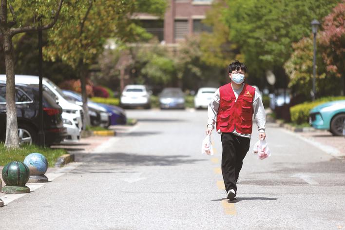 4月6日上午,在嘉興(xing) 秀洲區高照街道運秀社區,社區黨(dang) 員誌願者李斌行走在給居民送藥的路上。