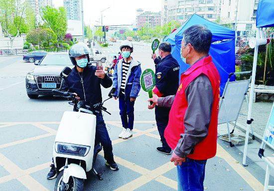 4月5日,在金華婺城區城東(dong) 街道通園路社區各暖心服務點、小區出入口,管理人員落實測溫、亮碼、戴口罩的要求,“場所碼”逢進必掃,社區自行設計了便攜式“掃碼杆”。使用“掃碼杆”後,過往車輛和行人掃碼的效率明顯提高,縮短了通過時間,拉開了誌願者和來往車輛及人員的距離,避免人員接觸。(時寬兵)