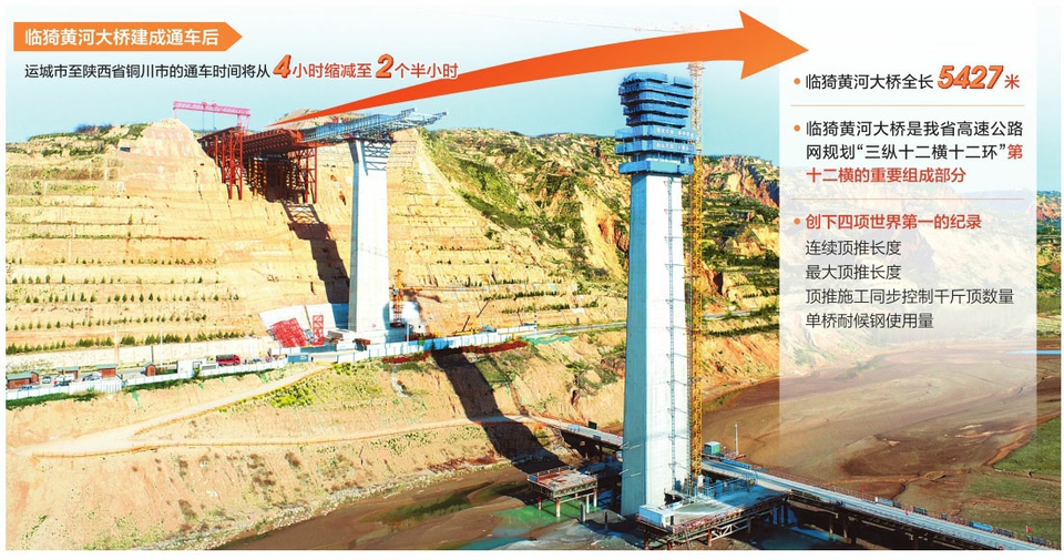 臨(lin) 猗黃河大橋是連接晉陝最長的黃河公路大橋,全長5427米,主橋采用等高度連續鋼箱組合梁,從(cong) 山西、陝西兩(liang) 處頂推平台對向頂推,這也創下連續頂推長度、最大頂推長度、頂推施工同步控製千斤頂數量以及單橋耐候鋼使用量四項世界第一的紀錄。