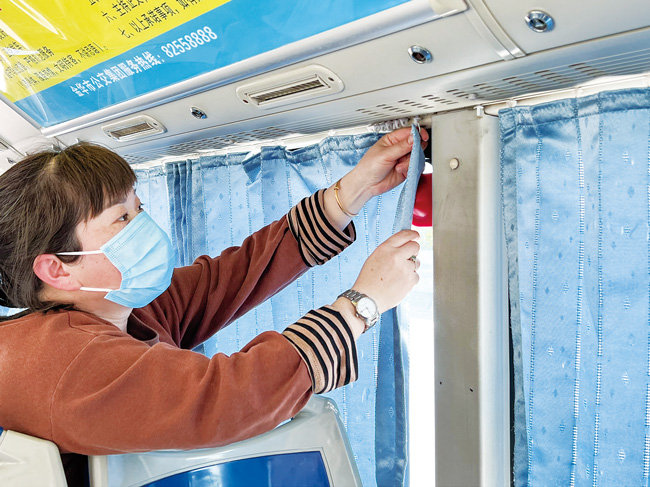 4月6日,金華市區523路公交車開始安裝遮陽簾。隨著天氣逐漸轉熱,金華金東(dong) 所有公交車將陸續安裝上遮陽簾。車隊長周英飛說,安裝了遮陽簾,乘車舒適度會(hui) 大為(wei) 改善。(李建林)