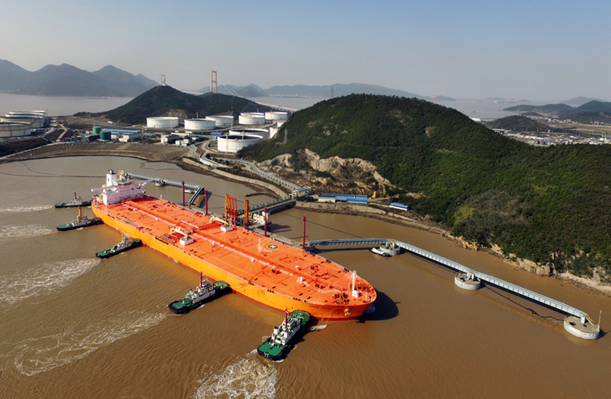 30萬(wan) 噸巨型油輪靠泊嶴山石油轉運基地。中國(浙江)自由貿易試驗區舟山管理委員會(hui) 供圖